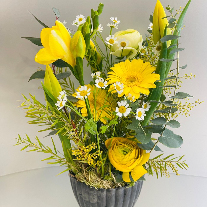 Diesen prächtig sonnigen Blumenstrauss gestalten wir in Gelbtönen, crème und weiss. Wir wählen Blumen passend zur Jahreszeit. Vase exkl.