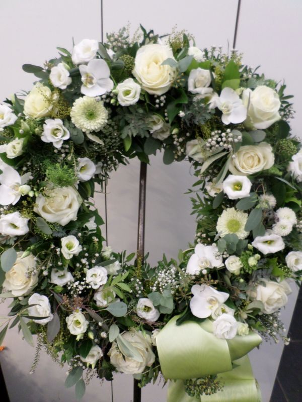 Dieser romantische Kranz besteht aus Rosen und anderen saisonalen Blumen. Er kann Ton in Ton oder bunt angefertigt werden. Im Bestellformular können Sie eine Schleife dazu bestellen und den Schleifentext eingeben.