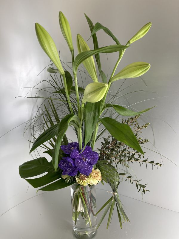 Die Vandablüten geben der dekorativen Gestaltung mit den weissen Longiflorumlilien das gewisse Etwas. Vase exkl.