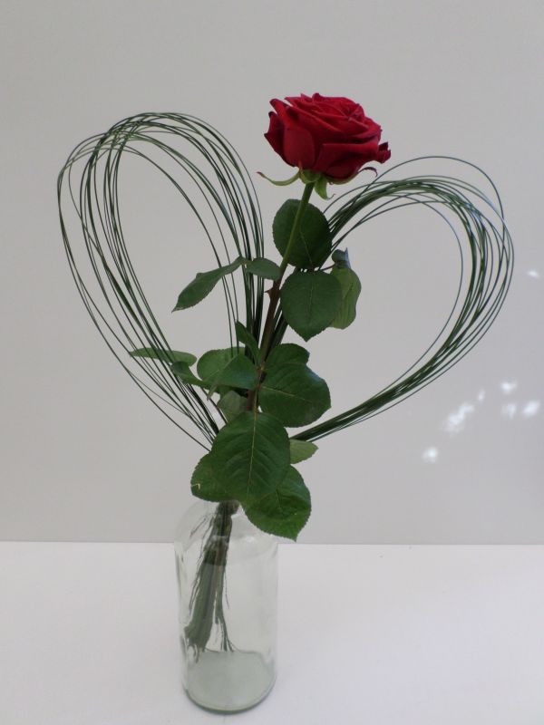 Klassische rote Rose im Grasherz. Vase inkl.