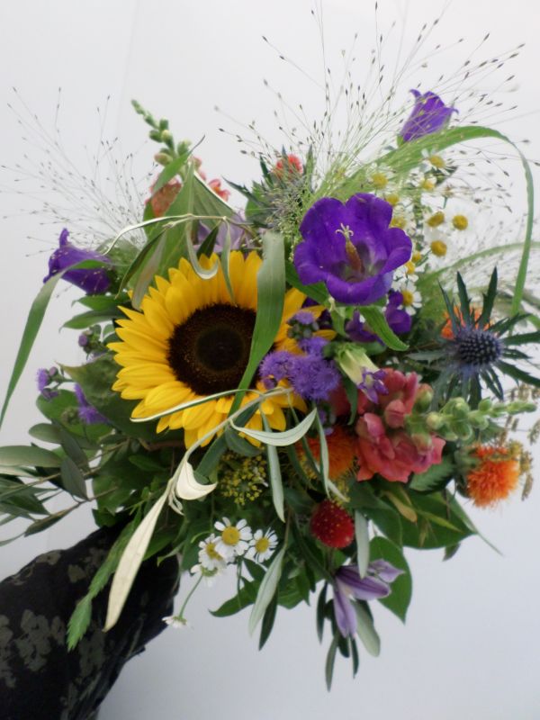 Diesen prächtig bunten Blumenstrauss gestalten wir in gelben, orangen, roten und blauen Tönen. Die Blumen kommen aus dem Seeland oder der Umgebung Berns. Nach dem Motto 'aus der Region - für die Region'. Wir wählen Blumen passend zur Jahreszeit. Vase exkl.