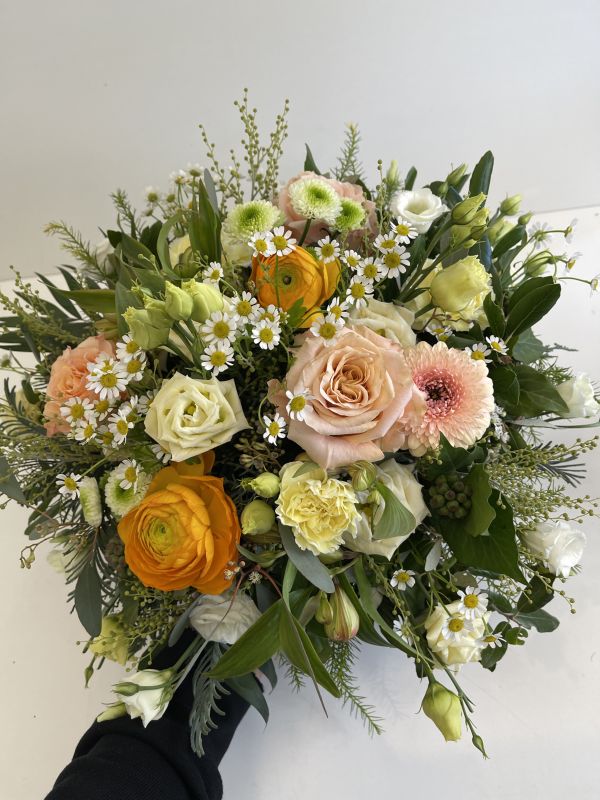 Hier sehen Sie eine sehr farbenprächtige, eher klassische Variante eines Trauergesteckes in creme, weiss und gelb. Auch bei dieser Gestaltung ist es möglich, Ihre Farbwünsche zu berücksichtigen. Topf inkl. Im Bestellformular können Sie eine Schleife dazu bestellen und den Schleifentext eingeben.