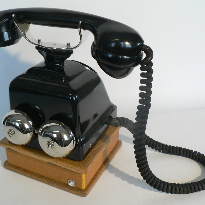 Original PTT telephone 1929 SIMOriginal PTT telephone 1929. The telephone is a revised original, the wooden base is a replica and contains a battery and a SIM card module.