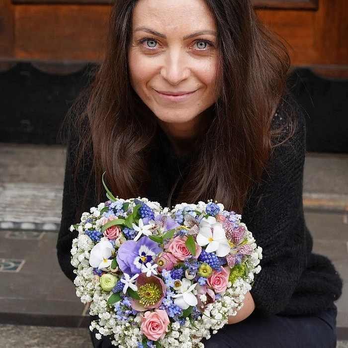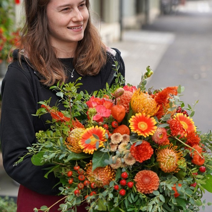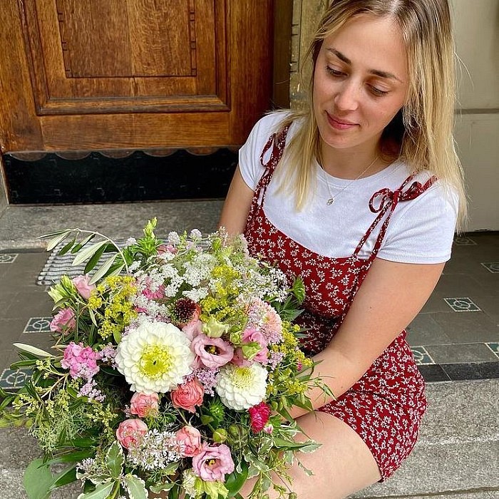 Fleurs de saison dans des tons clairs, décorées de manière ludique avec de la belle verdure.