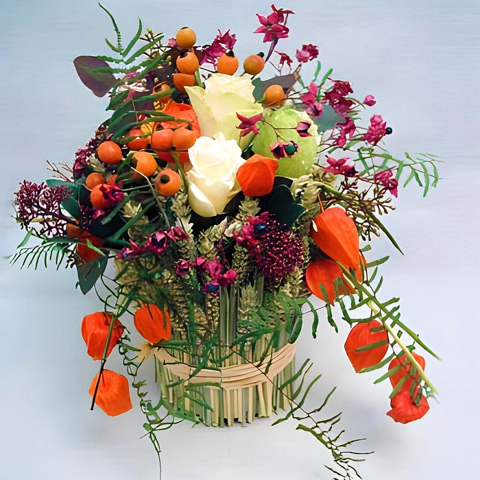 Roses and Physalis show the colours of late summer, contrasting with the brown colour of the straw. The flowers are standing in a straw-wrapped vase filled with water. Price includes the vase.