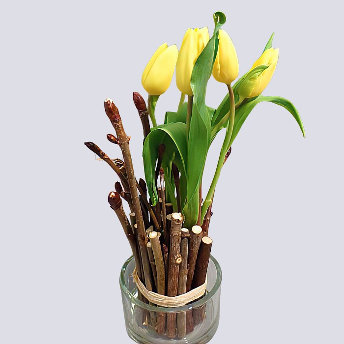Diese Kreation ist in einem Glas arrangiert. Das Holz selber schlägt aus und macht Blätter. Das Glas ist inkl.