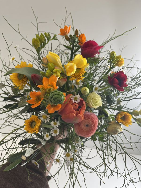 Das schlichte Heidelbeerkraut kombiniert mit Frühlingsblumen. Vase exkl.