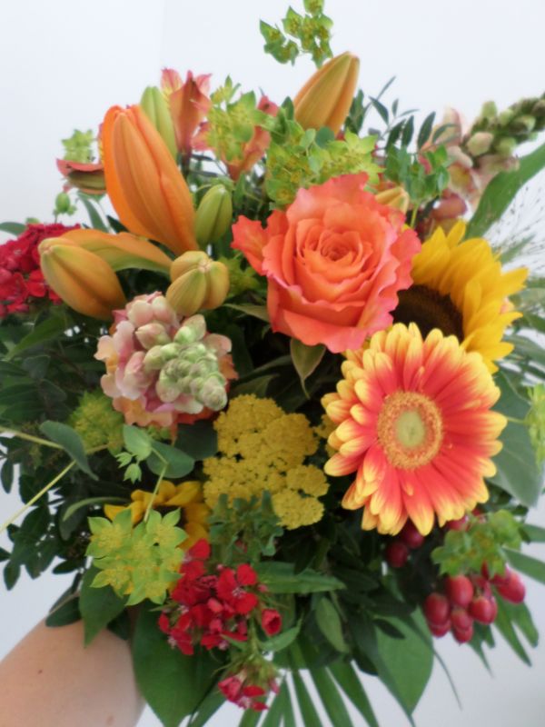 Diesen prächtig warmen Blumenstrauss gestalten wir in Gelbtönen, orange und rot. Wir wählen Blumen passend zur Jahreszeit. Vase exkl.