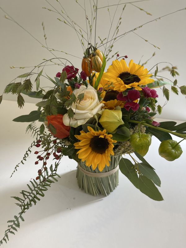Rosen, Physalis und Spätsommergrün kontrastieren mit dem herbstlichen Braun des Strohs. Die Blumen stehen im strohumhüllten Glas, welches mit Wasser gefüllt ist. Preis inkl. Vase.