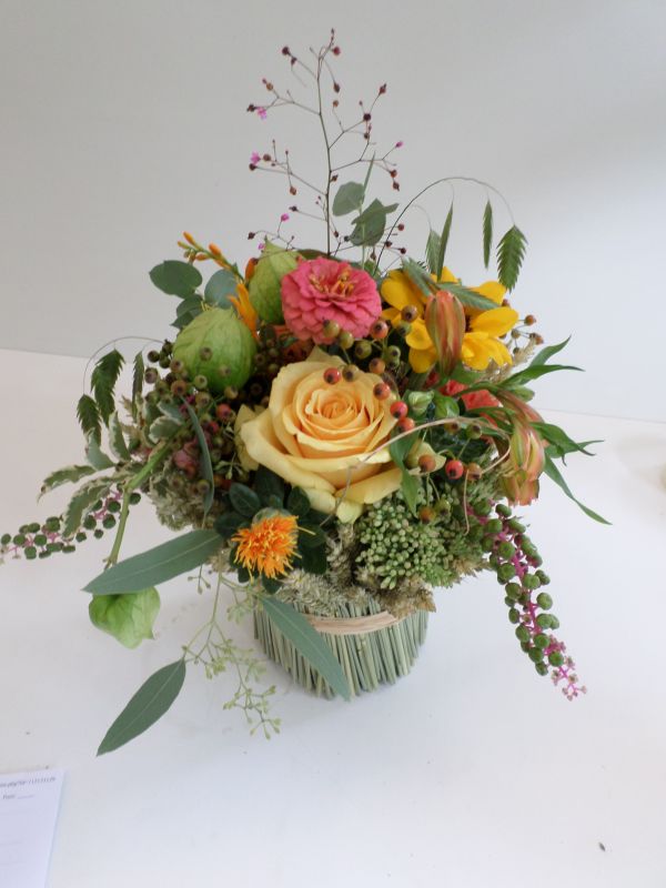 Rosen, Zinnia und Spätsommergrün kontrastieren mit dem herbstlichen Braun des Strohs. Die Blumen stehen im strohumhüllten Glas, welches mit Wasser gefüllt ist. Preis inkl. Vase.