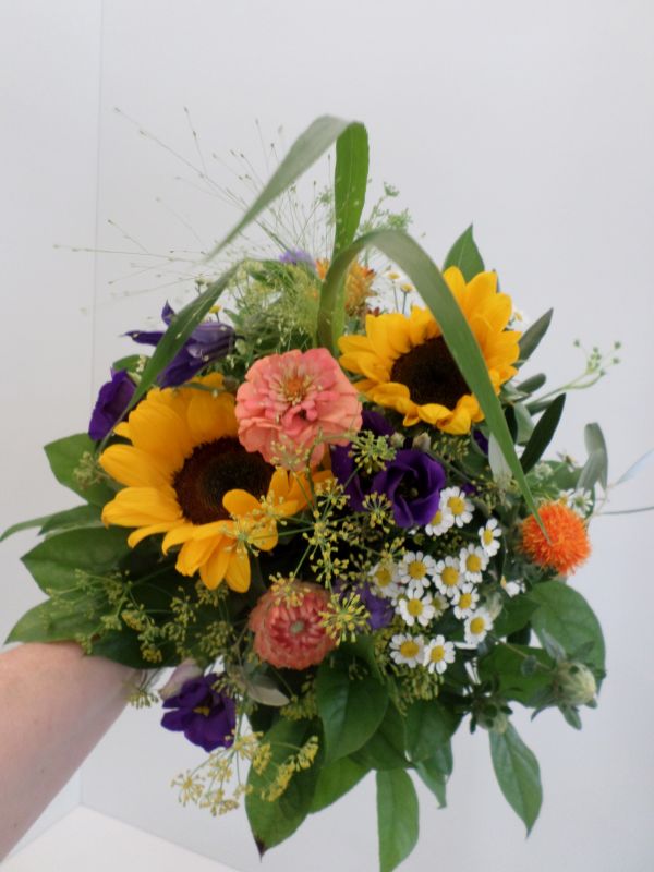 Diesen prächtig bunten Blumenstrauss gestalten wir in gelben, orangen, roten und blauen Tönen. Die Blumen kommen aus dem Seeland oder der Umgebung Berns. Nach dem Motto 'aus der Region - für die Region'. Wir wählen Blumen passend zur Jahreszeit. Vase exkl.