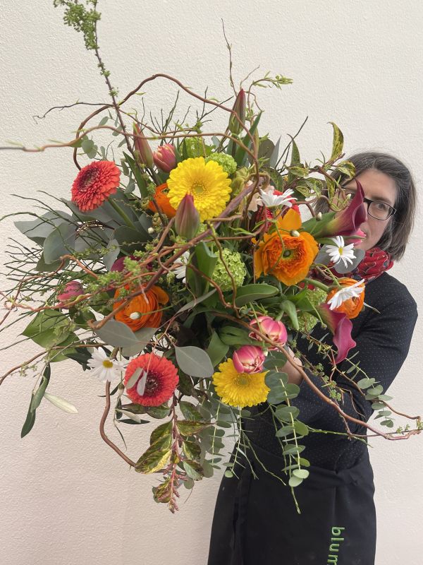 Dieser Strauss lebt von den Bewegungen der Frühlingsblumen wie Ranunkeln, Mohnblumen, Tulpen und Margeriten. Rotbraune Weidenäste, welche sich ineinander verschlingen, geben der Gestaltung einen weichen Rahmen. Vase exkl.