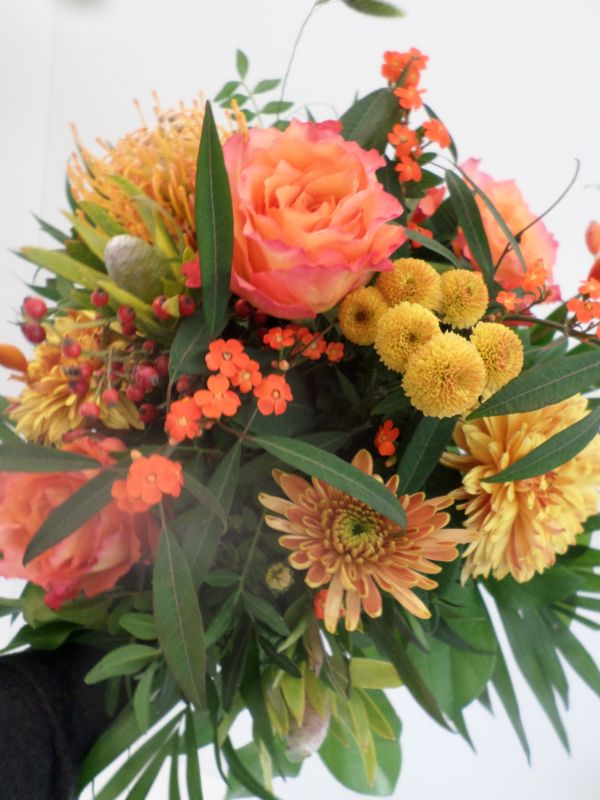Diesen prächtig warmen Blumenstrauss gestalten wir in Orangetönen. Wir wählen Blumen passend zur Jahreszeit. Vase exkl.