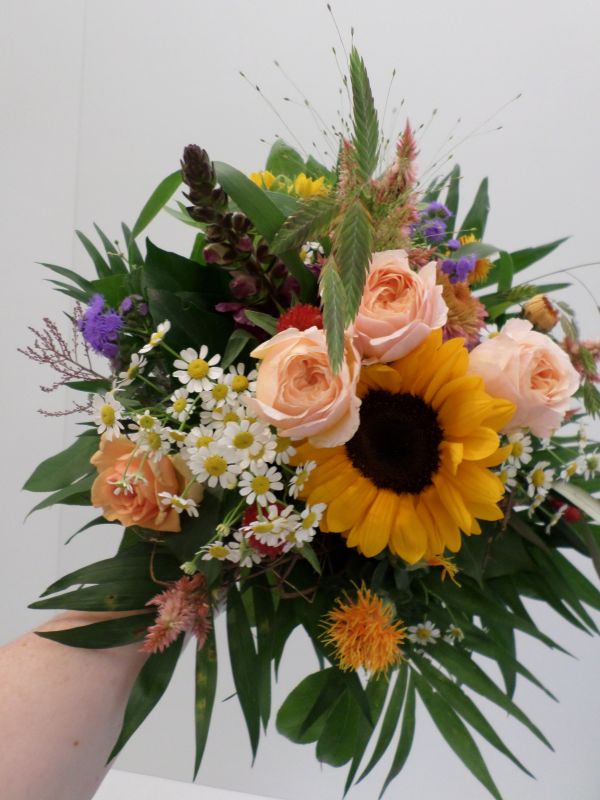 Diesen prächtig bunten Blumenstrauss gestalten wir in gelben, orangen, roten und blauen Tönen. Die Blumen kommen aus dem Seeland oder der Umgebung Berns. Nach dem Motto 'aus der Region - für die Region'. Wir wählen Blumen passend zur Jahreszeit. Vase exkl.