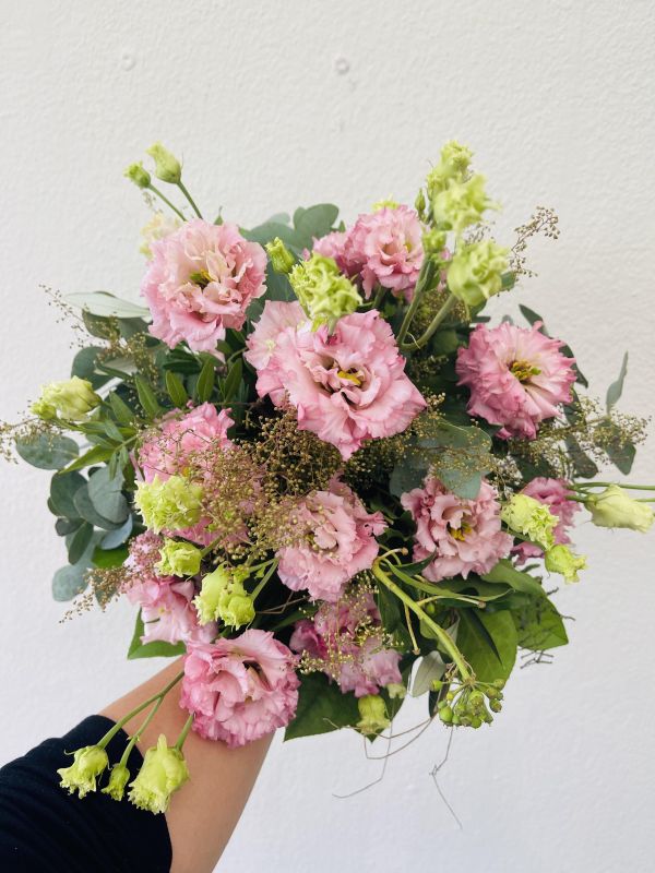 Die sonntagmorgendliche, romantische Stimmung wird durch die samtenen Farben der Lisianthus-Blüten und weiche, verspielte Dekorelemente erzielt. Dieser Strauss könnte am Sonntagmorgen das Brunchtischchen am Bett verschönern und die frühen Sonnenstrahlen durchs Fenster einfangen. Vase exkl.
