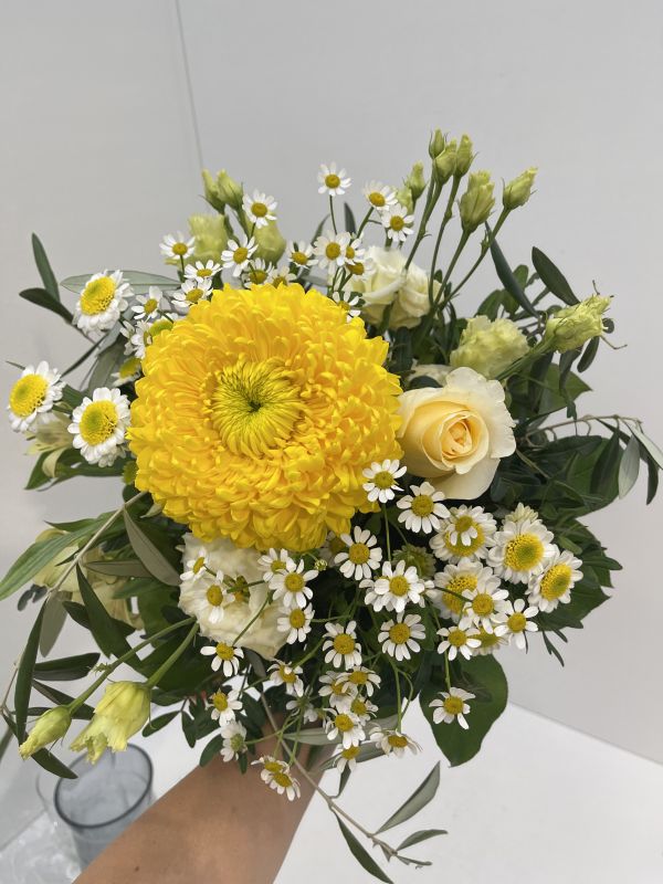 Diesen prächtig sonnigen Blumenstrauss gestalten wir in Gelbtönen, crème und weiss. Wir wählen Blumen passend zur Jahreszeit. Vase exkl.