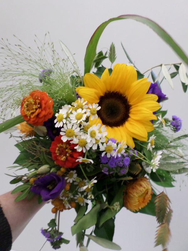 Diesen prächtig bunten Blumenstrauss gestalten wir in gelben, orangen, roten und blauen Tönen. Die Blumen kommen aus dem Seeland oder der Umgebung Berns. Nach dem Motto 'aus der Region - für die Region'. Wir wählen Blumen passend zur Jahreszeit. Vase exkl.