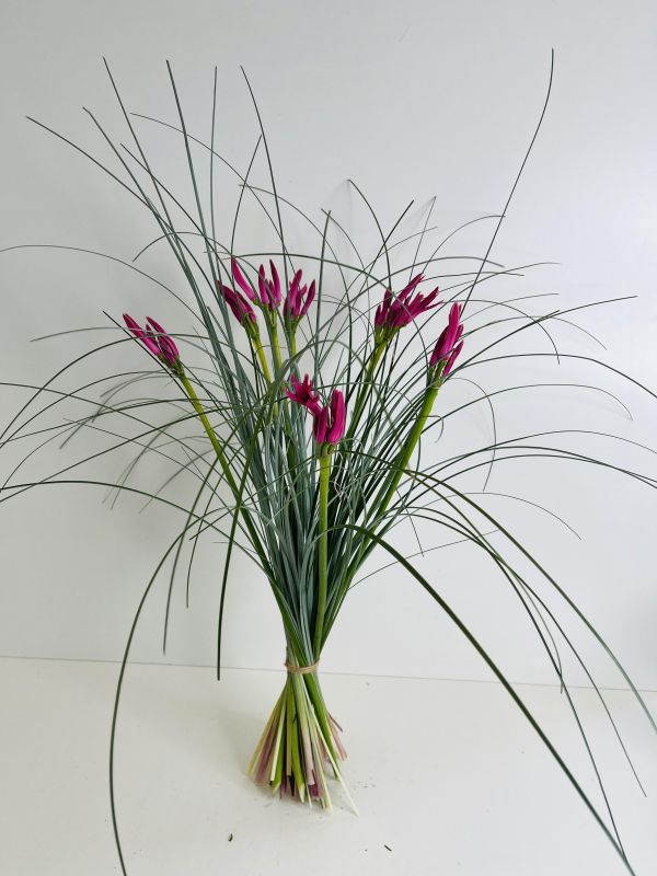 Natürliche, dekorative Gestaltung mit Nerinen - grafisch angeordnet, locker dekoriert mit langem Gras. Vase exkl.
