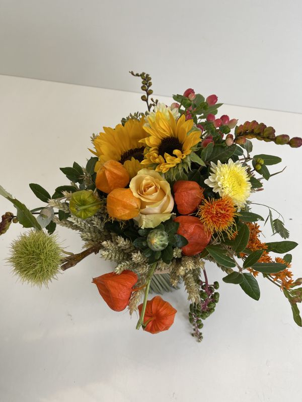 Rosen, Physalis und Spätsommergrün kontrastieren mit dem herbstlichen Braun des Strohs. Die Blumen stehen im strohumhüllten Glas, welches mit Wasser gefüllt ist. Preis inkl. Vase.