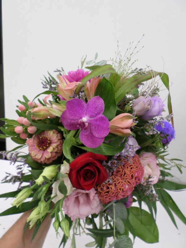 Dieser romantische und leicht verspielte Strauss kann für Sie das ganze Jahr in rosa, rot und blau gestaltet werden. Die Blumenwahl ändert sich entsprechend der Saison.