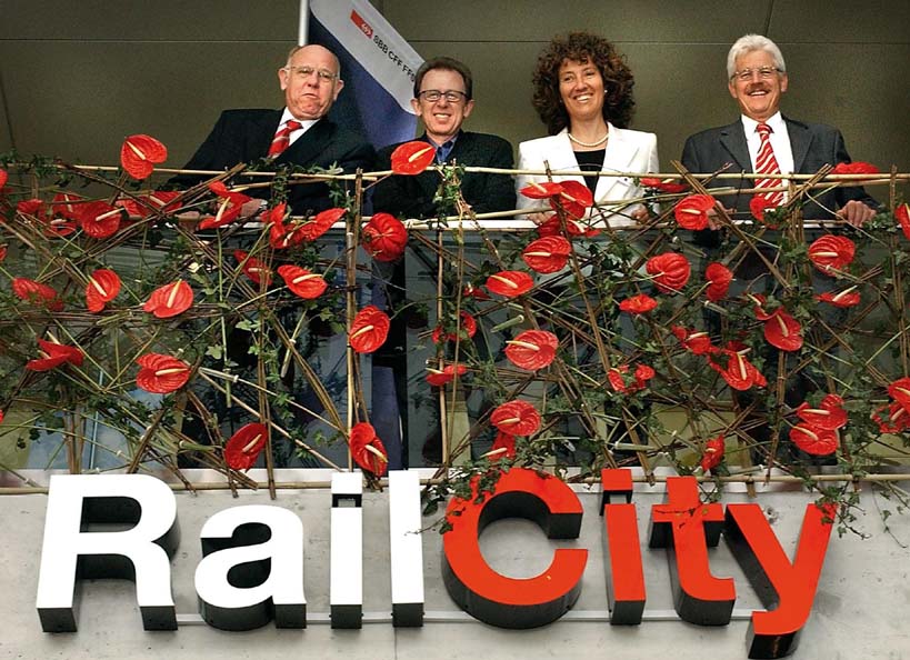 v.l.n.r: Stadtpräsident Klaus Baumgartner, Kabarettist Viktor Giacobbo, Regierungsrätin Barbara Egger-Jenzer und SBB-Chef Viktor Weibel