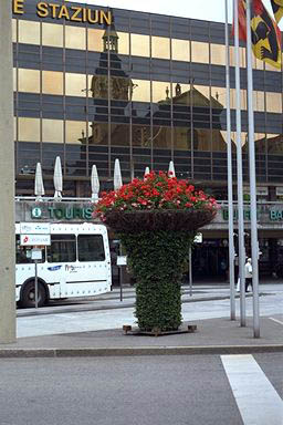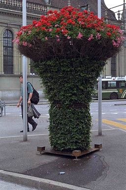 das erste Blumentram und platzierte riesige Geranientöpfe.