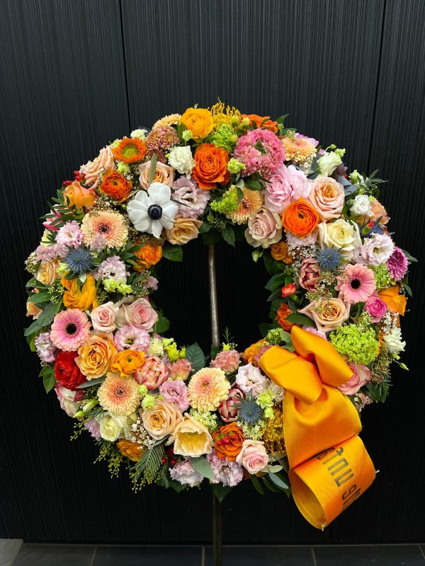 Kranz orange-pink. Im Bestellformular können Sie eine Schleife dazu bestellen und den Schleifentext eingeben.
