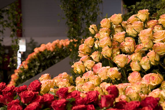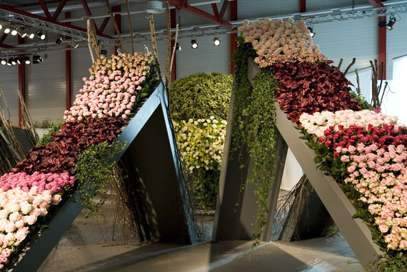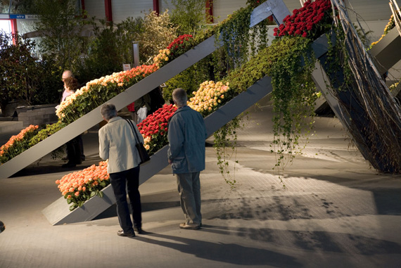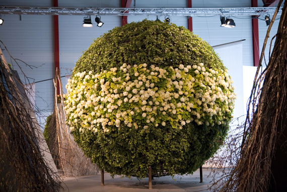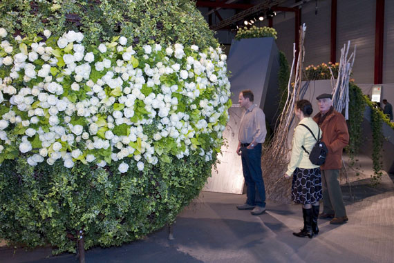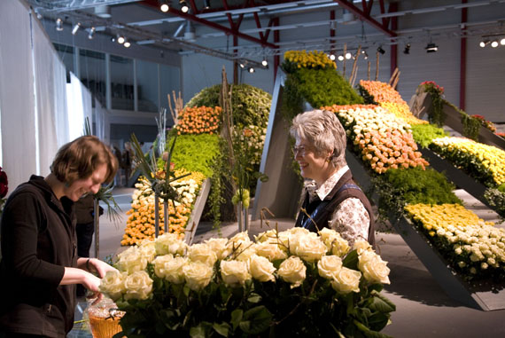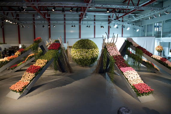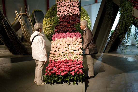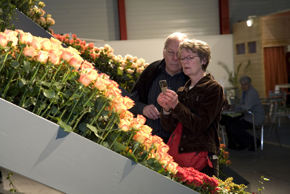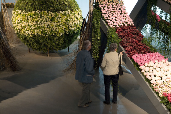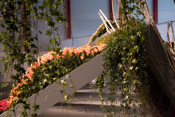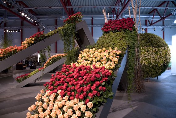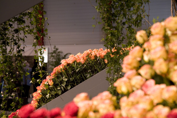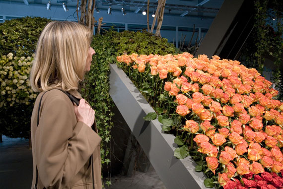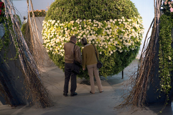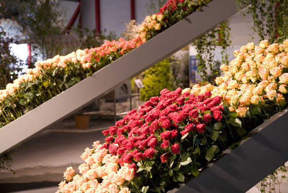 Ein Meer aus Rosenblüten.Die Blühende Halle stand ganz im Zeichen der Königin der Blumen, der Rose. Auf über 650 Quadratmetern sind mehr als 30 Rosensorten zu entdecken. Nach einer Einstimmung auf das Thema wartete das Innere der Halle mit einer floristischen Überraschung auf. Um eine riesige Perle verteilte sich wellenartig ein Meer aus Rosen und lud zum Geniessen und Staunen ein.