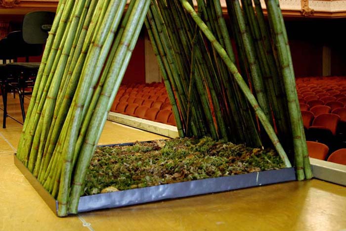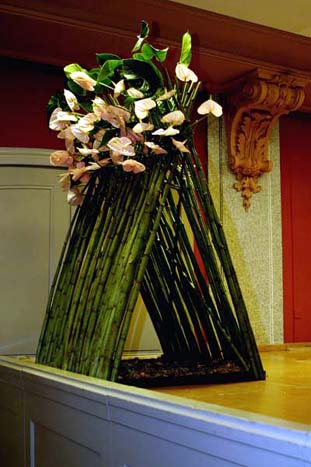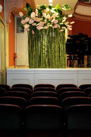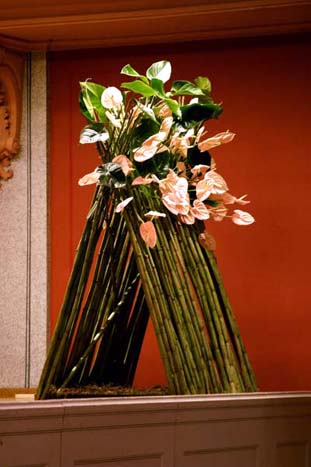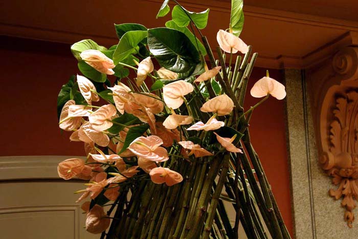 Wir präsentieren Anthuriumblüten auf modernen Skulpturen aus Bambus. Die repetitiven Strukturen passen zum Interieur, auch die Sitzreihen und Brüstungsornamente haben diesen Rhythmus.