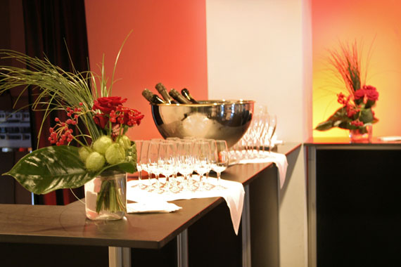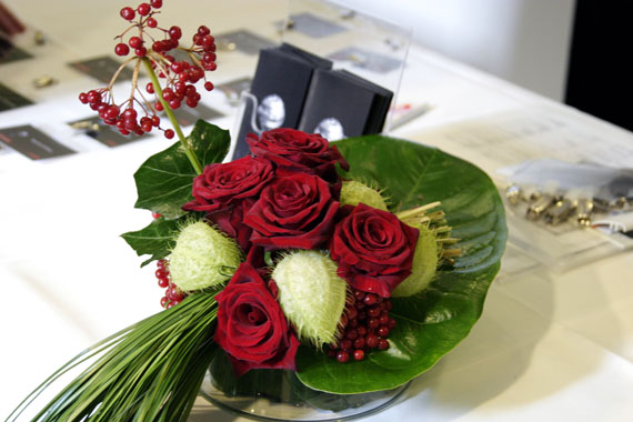 Das dunkle Rot der Rosen kombiniert sich gut mit dem schwarz-metallenen Interieure, die Schilfhalme machen den Raum hoch. Eine Dekoration, die zum guten Ton beiträgt.